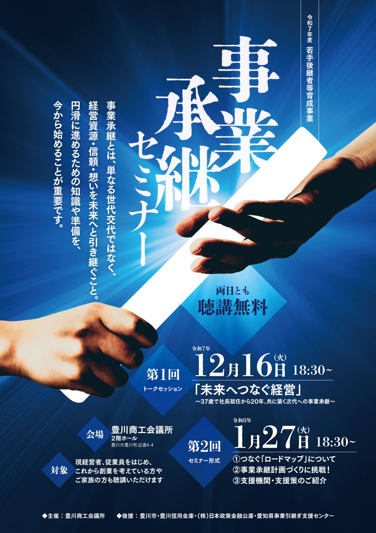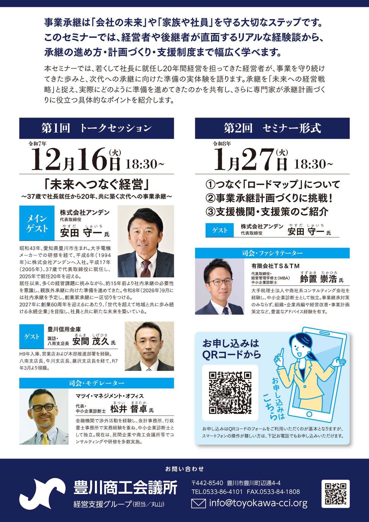 「未来へつなぐ経営」と題し、株式会社アンデンの代表取締役として活躍されている安田守一氏をメインゲストとして迎え、トークセッション形式とセミナー形式の事業承継セミナーを開催します。事業承継や創業をお考えの方やご家族の方等どなたでも参加できます。