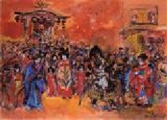 揺れる山車や人々の高揚を暖色の色彩と荒く軽快な筆跡で表し、花魁や歌舞伎者が練り歩く様を躍動的に描いています。