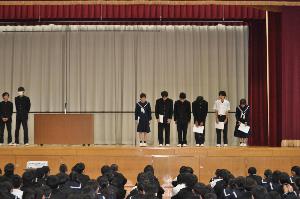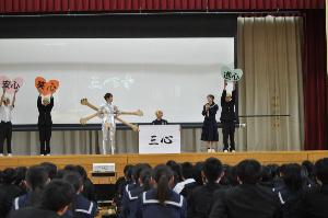10月24日、後期になって最初の生徒集会が行われました。後期生徒会執行部より後期生徒会のスローガン「三心」~安心・笑心・進心~が発表されました。これからは2年生が先頭に立って学校を引っ張っていくという決意が感じられる集会となりました。