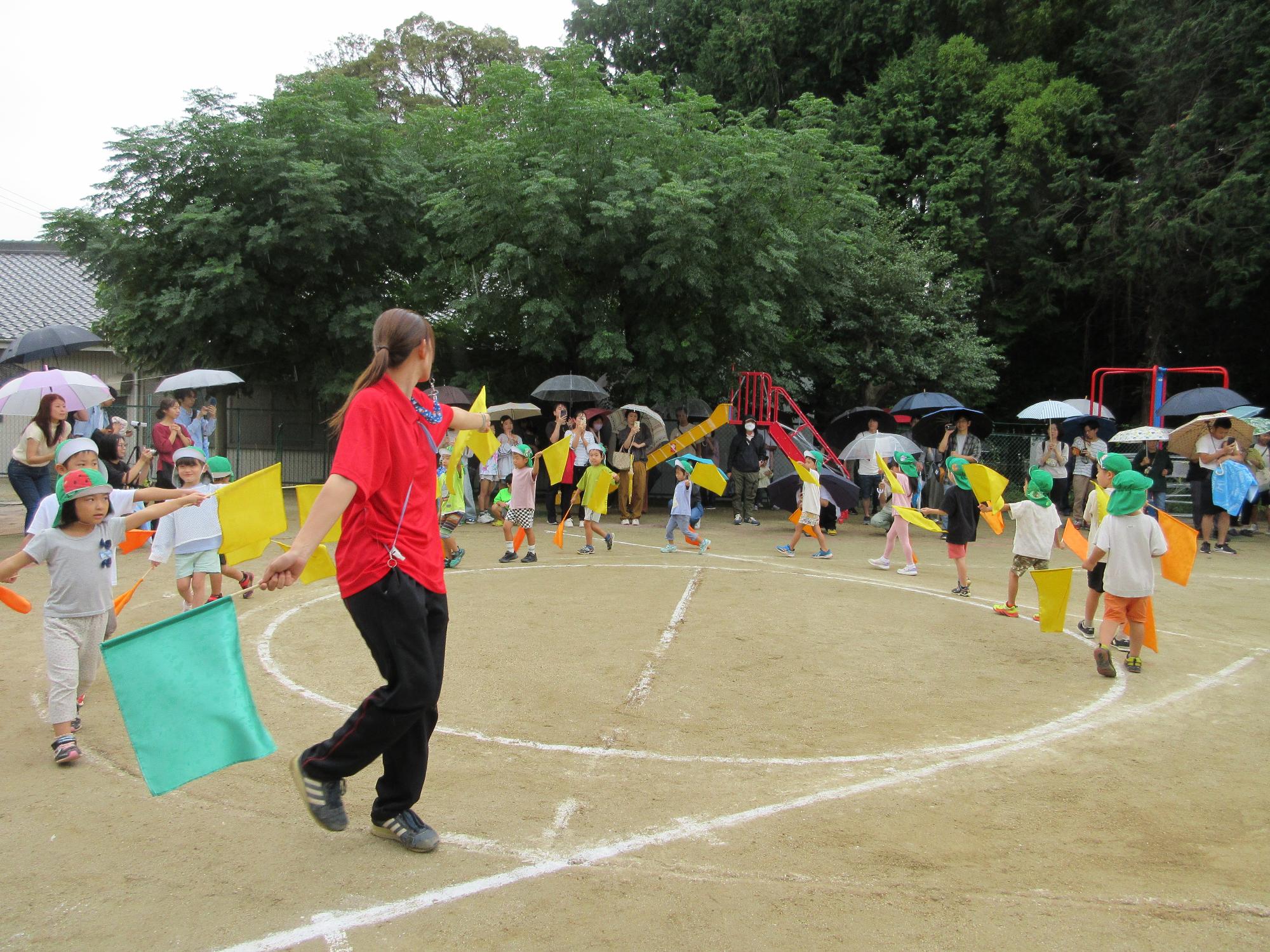 途中で雨が降ったり止んだり、中断をしたりしてご迷惑をおかけすることもありましたが、家族の方といっしょにあそぼう会を楽しむことができ、うれしく思いました。小さいお友だちはかわいい姿を、大きいお友だちはかけっこ、運動あそび、遊戯などかっこいい姿を家族の方に見てもらうことができました。