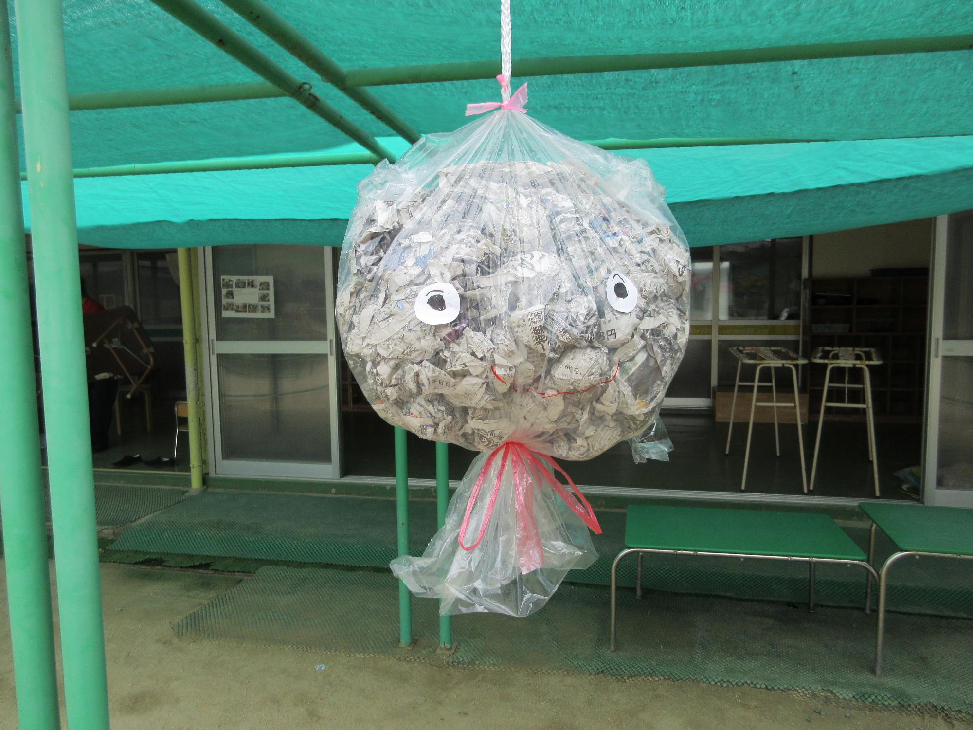 年長さんが作ってくれた大きなてるてる坊主さん、雨をやませてくれてありがとう☆