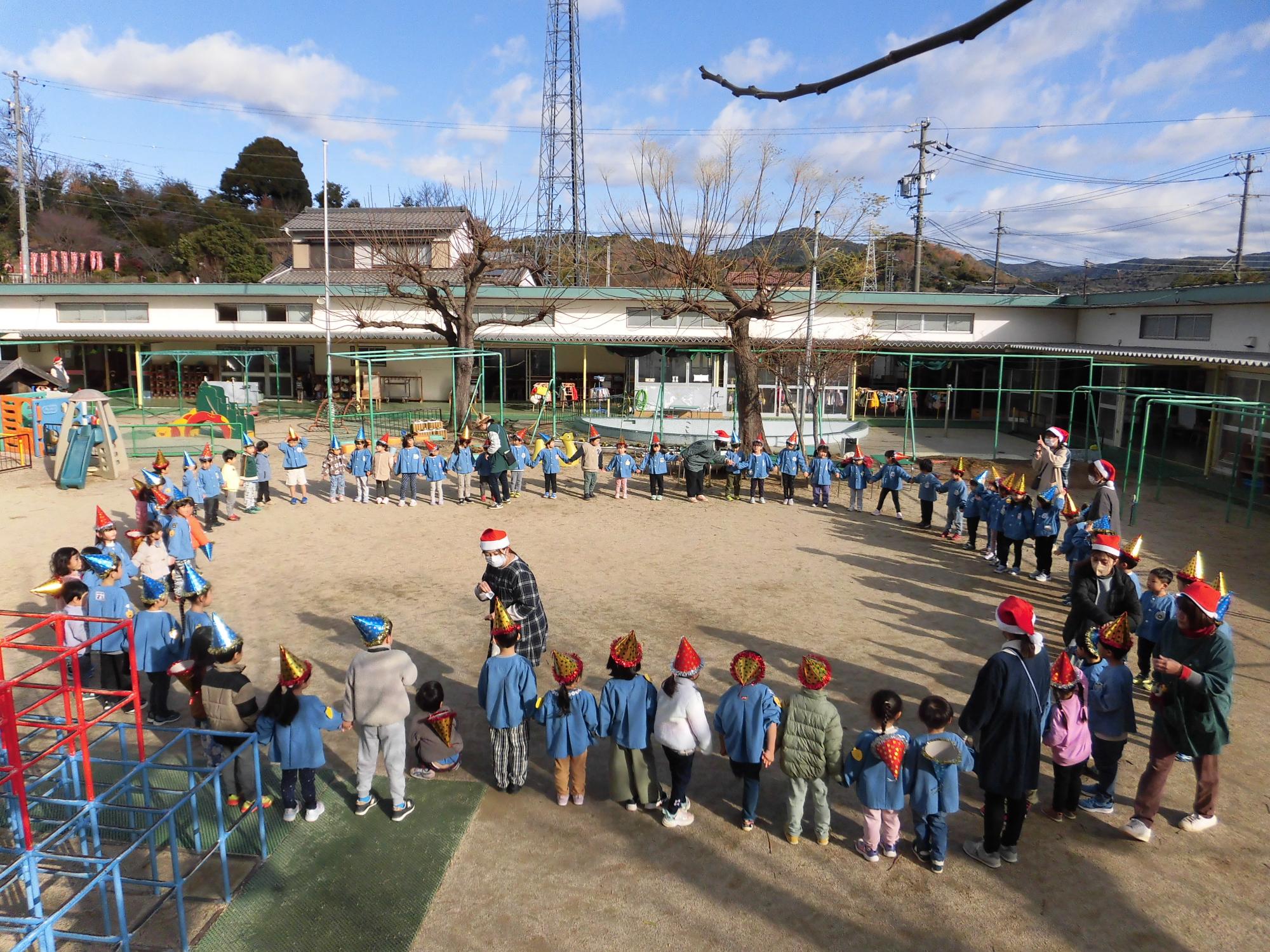 クリスマス会がありました。園庭に集まり、みんなで「あわてんぼうのサンタクロース」や「ジングルベル」を踊りました。そのあと、遊戯室で年長さんが「きらきらぼし」の演奏をしてくれました。