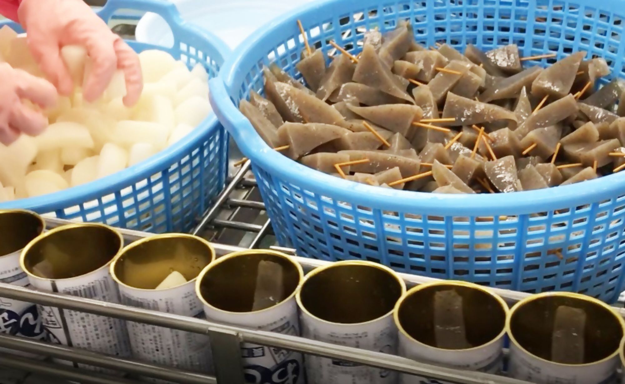 豊川市の工場で、一つ一つ手作業で具材を缶に詰めて丁寧に製造しています。だしがしっかり染みた本格おでんをぜひお楽しみください。