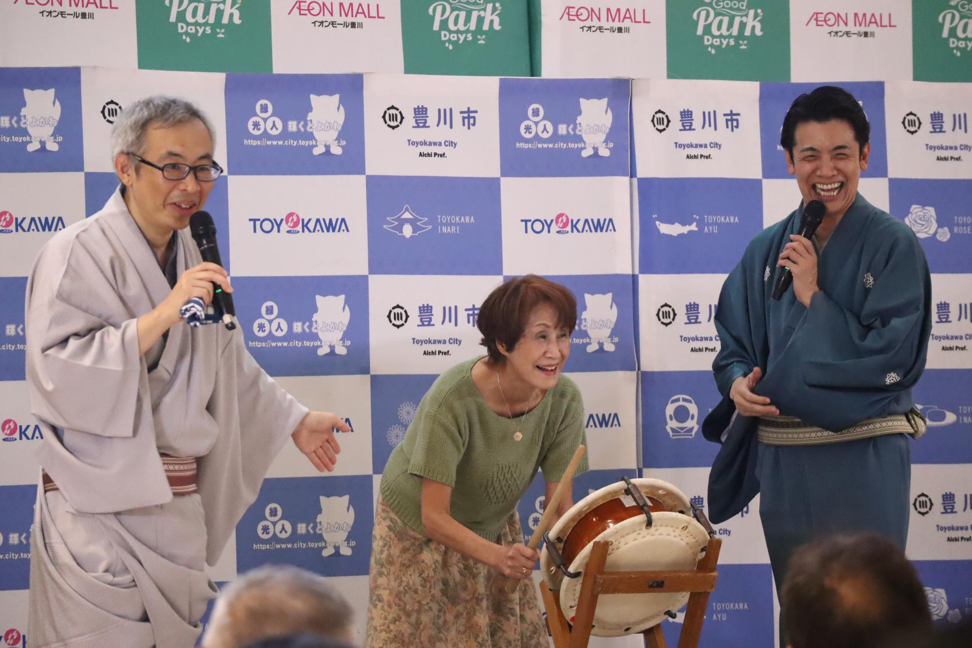 落語の始まりと終わりを告げる太鼓の披露、参加者による体験