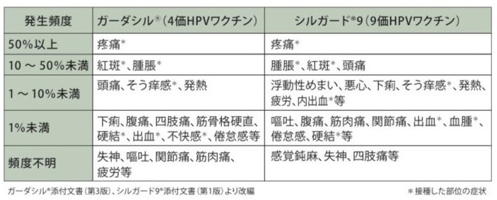 HPVワクチン接種後には、多くの方に、接種部位の痛みや腫れ、赤みなどが起こることがあります。まれに、重い症状(重いアレルギー症状、神経系の症状)が起こることがあります。因果関係があるかどうかわからないものや、接種後短期間で回復した症状をふくめて、HPVワクチン接種後に生じた症状として報告があったのは、女性の接種者1万人あたり、約10人で、このうち、報告した医師や企業が重篤と判断した人は、接種1万人あたり、約6人です。なお、男性の場合接種後の様々な症状が起こりにくい傾向があると言われています。
