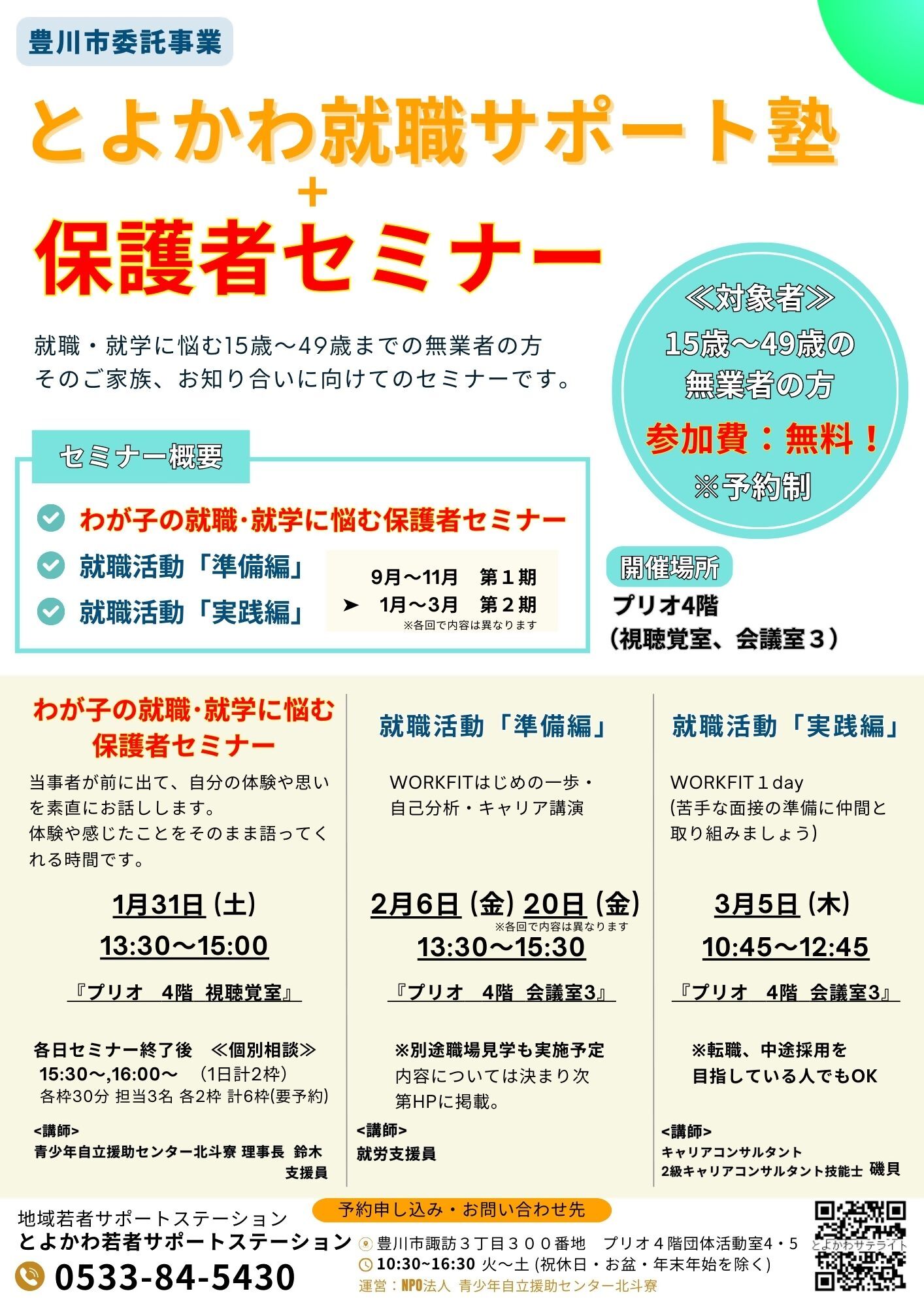 就職に悩む15歳から49歳までの若年無業者の方、そのご家族、お知り合いの方に向けてのセミナーと、これから就職を目指す方の就職サポート塾を開催します。
