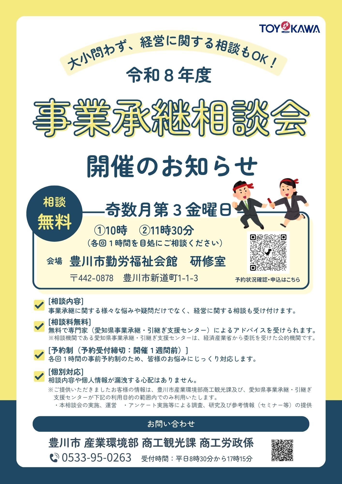 豊川市では、事業承継個別相談会を実施しています。事業承継に関する様々な悩みや疑問だけでなく、経営に関する相談も承ります。専門家による個別対応のため、相談内容や個人情報が漏洩する心配はありません。