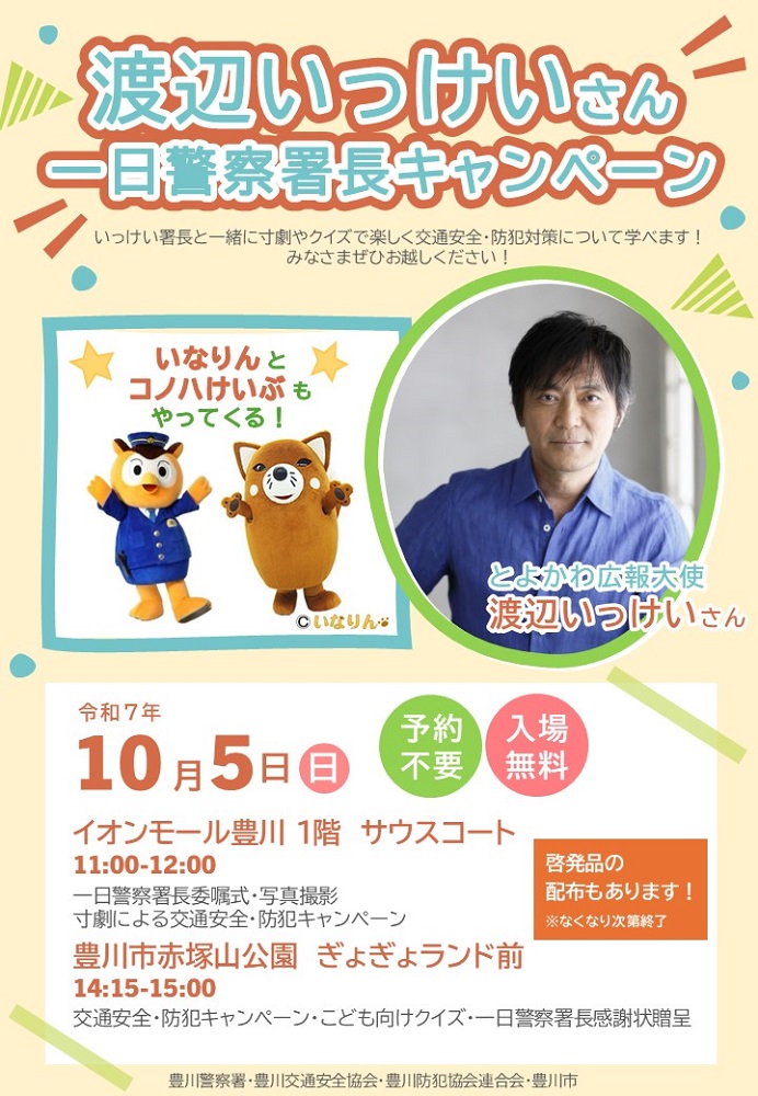 9月21日から10月20日まで行われる秋の安全なまちづくり市民運動期間中の10月5日に、とよかわ広報大使の渡辺いっけいさんが、豊川警察署の一日警察署長に就任し、イオンモール豊川、豊川市赤塚山公園で交通安全・防犯キャンペーンを行います。