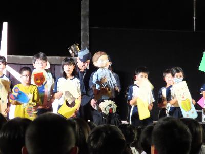 観劇会では、大きな人形の大胆な動き、工夫された舞台装置や演出など、舞台に目が釘付けになりました。そして、低学年から高学年まで全員が人形劇を楽しむとともに、オズの魔法使いの世界に浸ることができました。このような舞台を生で見ることができ、子どもたちにとってかけがえのない体験になりました。また、これからはじまるどうだん発表会に向けて、大きなヒントをいただきました。