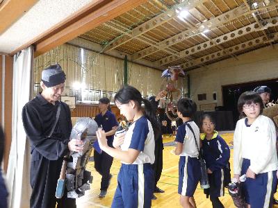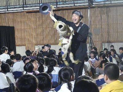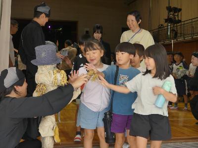 令和7年度「学校における文化芸術鑑賞・体験推進事業(ユニバーサル公演事業)」及び「舞台芸術等総合支援事業(学校巡回公演)」により、10月1日(水曜日)の3・4時間目に、むすび座の皆様をお招きし、全校で「オズの魔法使い」の人形劇を鑑賞しました。
