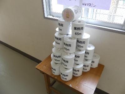 牛乳パックリサイクルの成果として、学校給食課よりトイレットペーパーをいただきました。保健室の前に飾ってあります。励みになりますね。