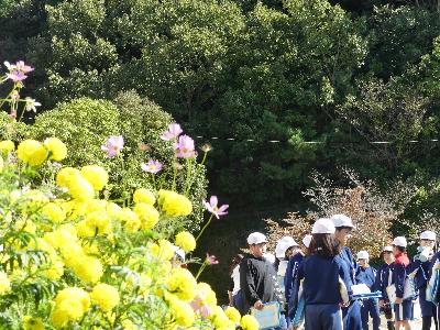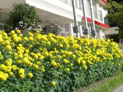 学校の花壇には、黄色のマリーゴールドが咲いています。今、まさに満開です。また、子どもたちが植えたコスモスも、見ごろを迎えています。それぞれの季節で、花を楽しんでもらえるといいです。