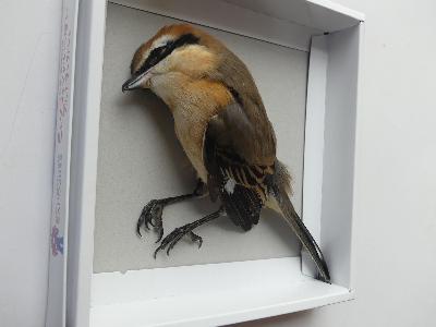 少しの間、モズを展示して子どもたちに見てもらいました。モズは秋になると高い声で鳴き、よく見かけるようになります。スズメよりも一回り大きく、エサであるカエルや虫などを木の枝に刺す「はやにえ」の行動が有名です。ぜひ、街中で探してみてください。