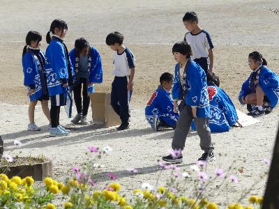 3年生が運動場で気温を測っていました。理科の「日なたと日かげ」の勉強ですね。どうだん発表会の練習もあるのでしょう。法被を着ている子もいます。