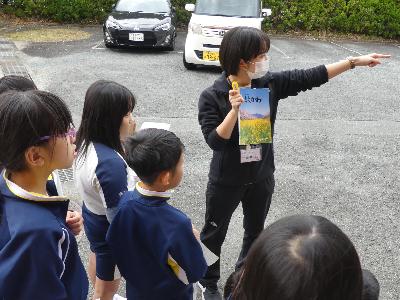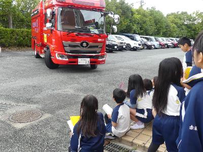 3年生が、校内の消防施設の学習で校内を巡っている時のことです。消防自動車が赤坂小学校にやってきました。聞くと、消火栓の点検に来たそうです。いい機会なので、消防自動車を見せてもらいました。