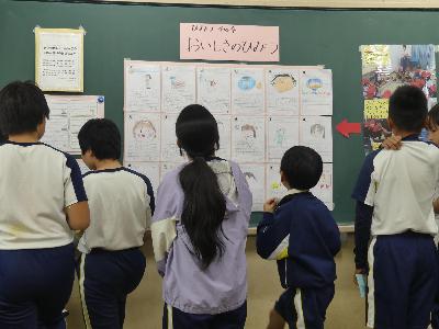 1年生は、6年生を「びっくり きゅうしょく ひみつてん」に招待していました。自分たちの学習で学んだことをみてもらったり、担任の先生に食育の絵本を読んでもらったりと、楽しいひと時を過ごすことができました。
