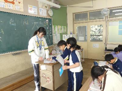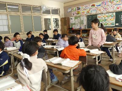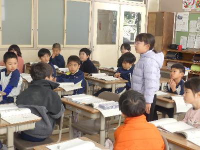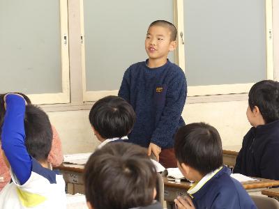 2-1が、国語でカルタづくりの授業を行っていました。どんなカルタにするといいのか発表する中、発表者はクラス全体に伝え、聞く人は発表者の方を向くことを繰り返し行っていました。とても大切なことだと感じました。
