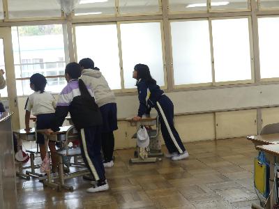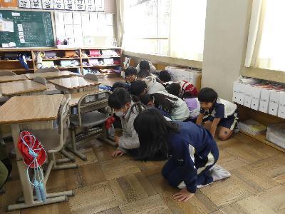 同じ日の5時間目終了後に、不審者対応の避難訓練を行いました。。子どもたちは、放送を聞いたら、自分たちで教室内の入り口付近にバリケードを作り、教室の奥で静かに待機します。