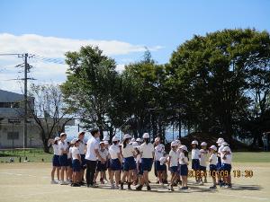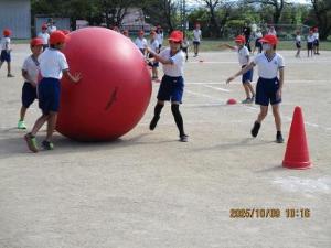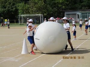 1回試技をしてから、赤組、白組に分かれて作戦と練習タイムを取りました。高学年をコーナー部分に配置したり、大玉の送り方を低学年に指導したりする高学年の姿がありました。