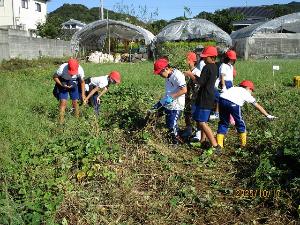 来週には芋ほりが予定されているので、今日は、芋ほりをしやすくするために畝の周りの草を取り、長く伸びたツルを切る作業をしました。