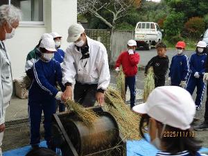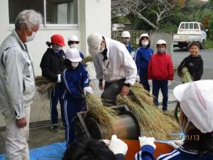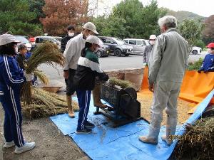 地域のお米の先生の手ほどきを受けながら、昔ながらの足踏み式の脱穀機を使って脱穀をしました。