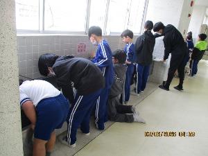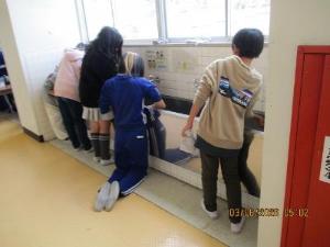 たてわり班ごとに、普段みんなが使っている水場をきれいにしました。習字で使う墨汁がタイルの目地に残っていましたが、スポンジを使ってきれいに落としました。
