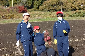1年生と6年生を、地域の定盛さん・加藤さん・権田さんが、芋ほりと焼き芋に招待してくれました。さすが、プロの畑の実りは違います。土を掘るとどっさりサツマイモが出てきます。連なったお芋を持ち上げるとずっしり重い!6年生と1年生が仲良く作業する姿が微笑ましい!その後、土手に腰かけて焼き芋を食べました。赤色の芋焼き器で焼いた焼き芋は最高の味でした。貴重な体験をさせていただいた地域の方々に感謝です!