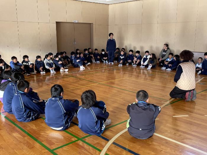この日、校内に侵入した不審者から身を守る訓練を行いました。非常ベルが鳴り、今回は体育館に逃げました。教師はさす股で対応します。子どもたちは、落ち着いて避難します。不審者からいち早く距離をとることや冷静な避難を学びました。