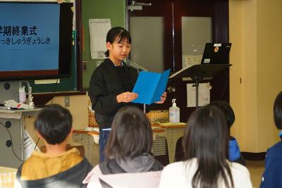 2学期の終業式が行われました。3人の代表児童が2学期を振り返って作文を発表しました。充実した2学期を過ごしたことと次の3学期への思いが伝わる内容でした。校長先生からは、地域の方からもらったカブトムシの幼虫が、すでに大きく育ち、冬の間にしっかり準備をしているお話がありました。この冬休みに、新年に向けしっかり準備できるといいですね。
