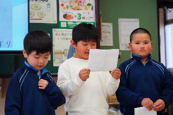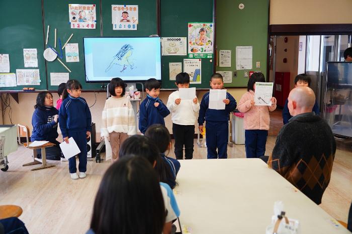 1年生が給食後に冬の探鳥会の報告をしました。橋の上から見たキセキレイや、辺りに居ついているセグロセキレイやハクセキレイの観察の様子を報告しました。とても上手に描いた観察記録の鳥の絵にびっくりです。
