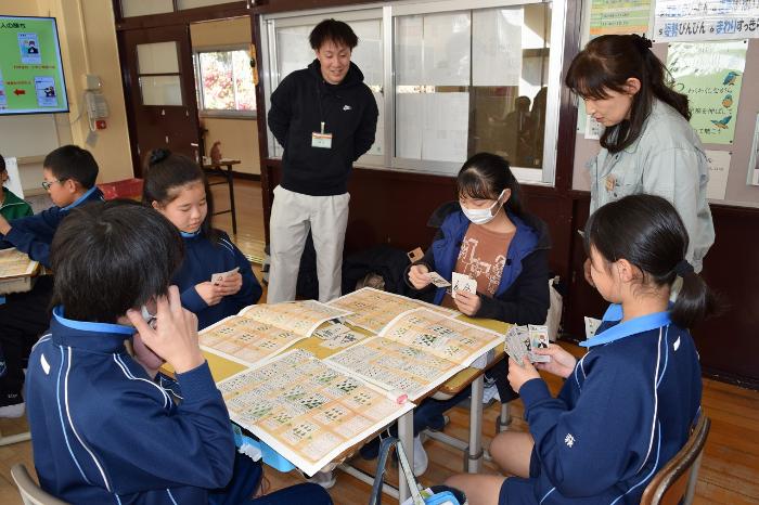 三河農林水産事務所の林務課、豊川市の農務課の方々による出前授業が行われました。萩町にもたくさんの森があります。それら森がどのように管理され、役立っているのかを学びました。山の手入れとして、下刈りや間伐、山に入るための林道管理について、詳しいことも教えてもらいました。一番盛り上がったのは「ZORING」というボードゲームです。森林づくりを題材にしたゲームで、困難や解決策を学べます。鹿が悪さをすることにびっくり!