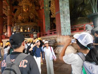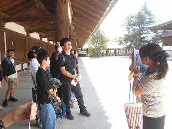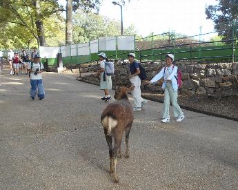 1日目は、奈良学習。バスガイドさんの話を聞いて拍手やお礼の言葉が飛び交いました。予定より早く到着した法隆寺では、周りに他校がいない珍しいタイミングで見学をしました。五重塔の中のお釈迦様の様子をじっくり見学することができました。奈良公園分散学習では、地図を片手に班で決めたコースを回り見学や買い物、シカとのふれあいも楽しむことができました。