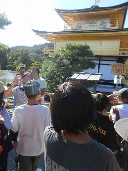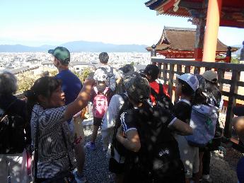 2日目は京都。朝の支度を手際よく済ませた6年生は、予定より30分早く旅館を出発したので、その分見学時間を長くすることができました。三十三間堂では、自分や家族に似た千手観音像を探しました。清水寺では、中門の横から京都の街を一望し、金閣寺では光輝く豪華さに目を奪われました。