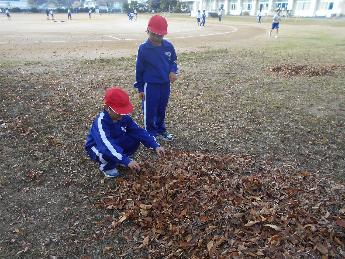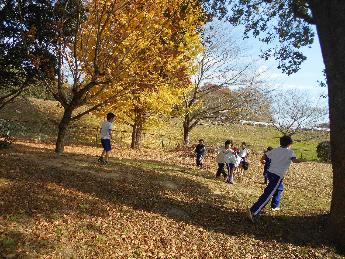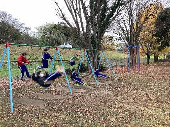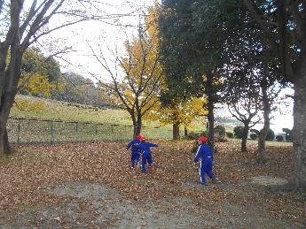 運動場の景色がすっかり秋一色になりました。ケヤキやメタセコイヤの葉っぱがどんどん舞ってきます。イチョウの木もきれいな黄金色になってきました。コナラの木には小さなドングリがついています。落ち葉を踏む音を楽しみながら鬼ごっこをしたり、ドングリを集めたりして秋を楽しんでいます。落ち葉の絨毯の上でブランコを楽しむのも今ならではですね。