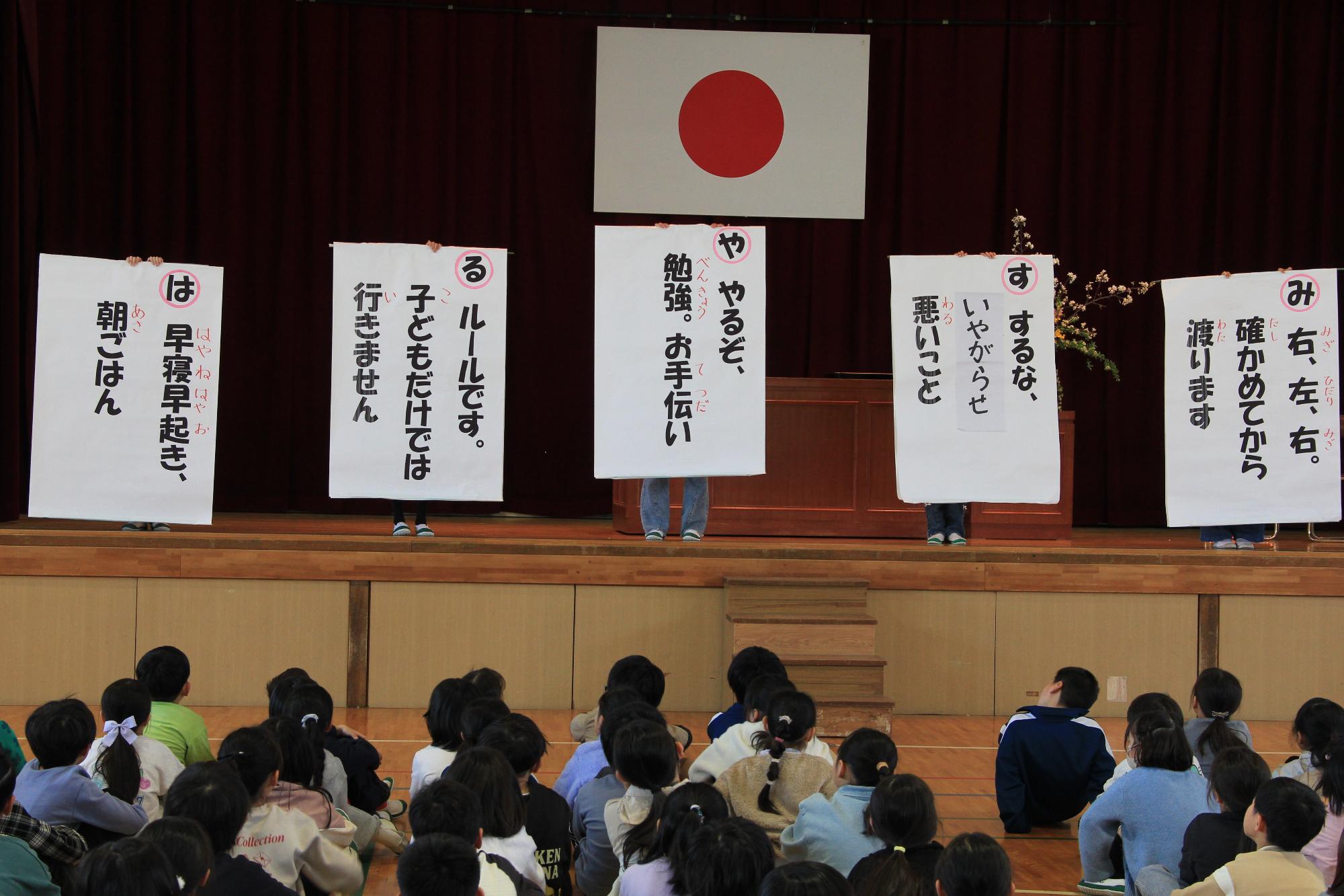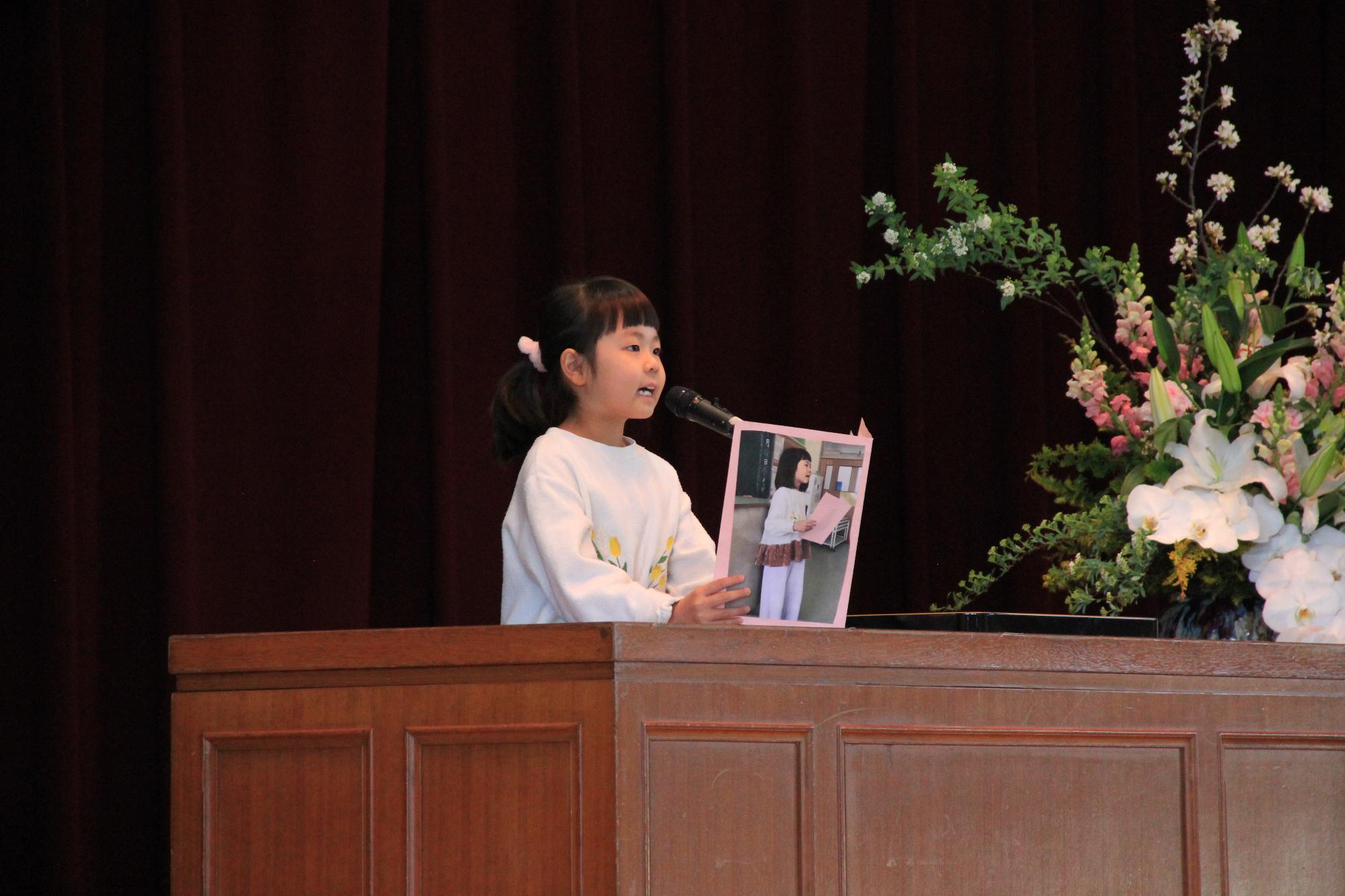 1年生と5年生の2人が、一年間でがんばったこと、そこから気づいたり考えたりしたことを発表しました。「べんきょうがたのしくなったのは、がんばったしるし」など自分の言葉で伝え、成長が感じられました。校長先生も4月の始業式で話した4つの約束を確かめ、子どもたちは1年間のふり返りができました。
