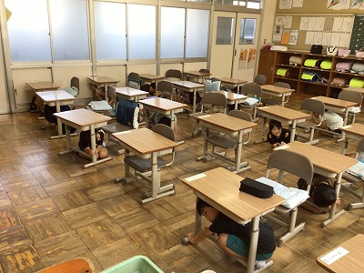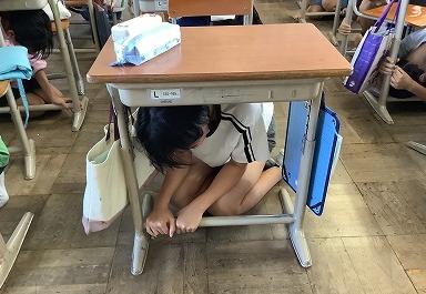 今回は防災担当から、抜き打ち訓練後に講話の時間を設け、正しい机の下へのもぐり方を伝えました。実際にもう一度机の下にもぐると、四つ足で、しっかりと机の脚を持つ子が増えました。