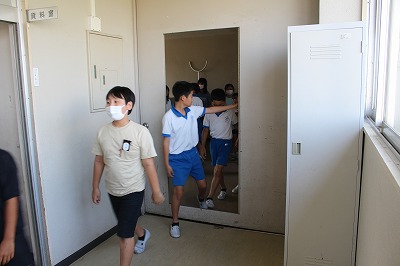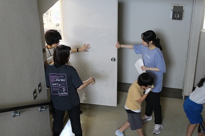校内で火災が発生した場合は、煙を探知して防火扉が閉まります。その場合は手で防火扉を開けて避難することが大切です。この防火扉の通り方を含めて、正しい避難のしかたを学びました。