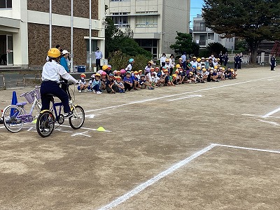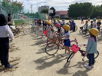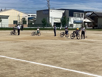 正しい自転車の乗り方をお話として学び、実際に運動場にかいた練習コースを乗って確かめました。また、自転車の正しい整備の方法も学びました。