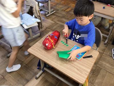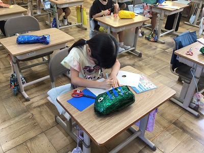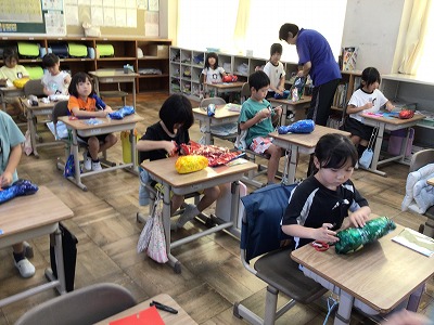 1年生は「キラキラ☆桜木水族館」新聞紙で型をつくり、そこにセロファンで巻いて、かわいらしいお魚を作りました。学年全部の魚が並ぶと、それだけで水族館のようです。