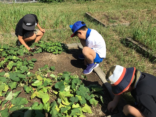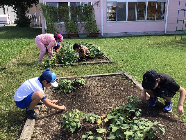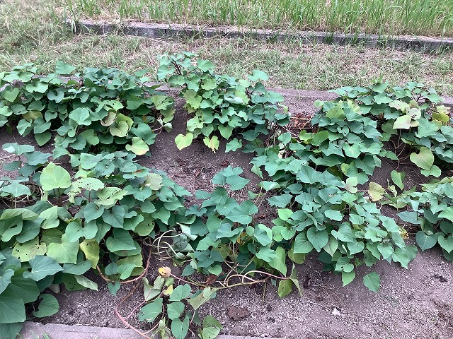 芋の葉の色が黄色くなったら収穫です。無事収穫できるとよいです。子どもたちは、その日を楽しみにしています。