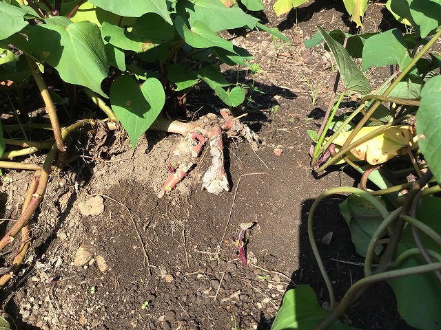 しかし、本年度は、異常な夏の暑さがあったために、例年に比べて成育の状態が良くありませんでした。それでも、草取りや水やりをがんばって、もうすぐ収穫の時期まで来ることができました。芋の種類は「紅はるか」です。