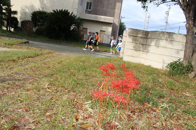 北門のそばには彼岸花が植わっていて、毎年10月の時期になると鮮やかな朱色の花を咲かせます。今年は、近隣の佐奈川などの彼岸花よりも、出るのが遅く、10月中旬になってようやく花を咲かせました。「お彼岸」からは3週間遅れています。彼岸花が咲くと本格的な秋に入ることを感じます。