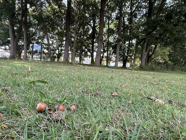 地面にはたくさんのドングリでいっぱい。