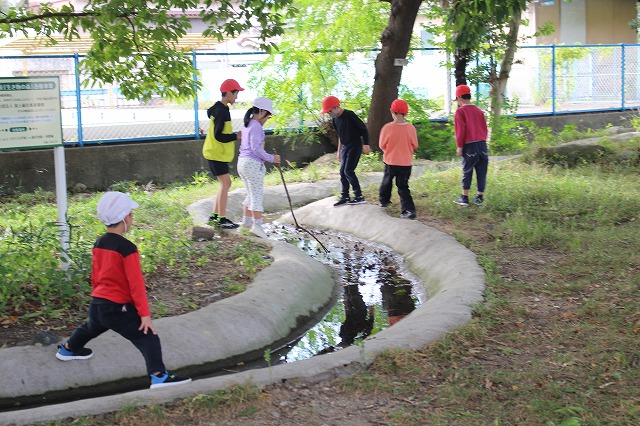 川では子どもたちが集まって遊んでいます。