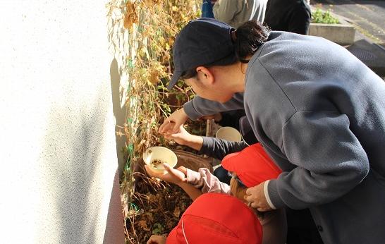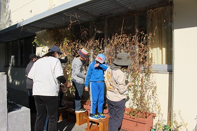 図工室横で緑のカーテンとして育てていたアサガオと、理科の実験用に育てていたホウセンカは、秋の深まりとともに、すっかり茶色くなりました。しかし、よく見ると、実がたくさんついています。