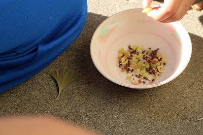 そこで、4組の子たちに頼んで、アサガオとホウセンカの実を収穫してもらいました。実の中には種がぎっしり。この種によって次の年へと命をつないでいきます。そんな植物のすばらしさも感じた収穫になりました。