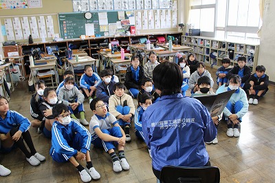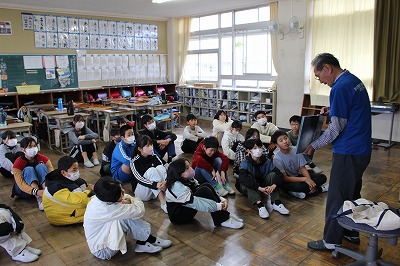 6年生は11月21日(金曜日)、社会見学で豊川海軍工廠平和公園に行きます。その直前の11月12日(水曜日)、生涯学習課主催で、豊川海軍工廠平和公園の語り部をしている方2名の方が、6年生に「あの八月七日」の読み聞かせに来てくださいました。