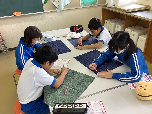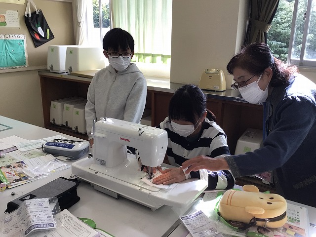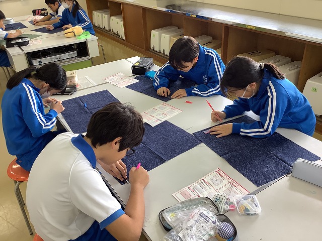 家庭科の授業で、ミシンを使ってランチョンマットをつくっています。