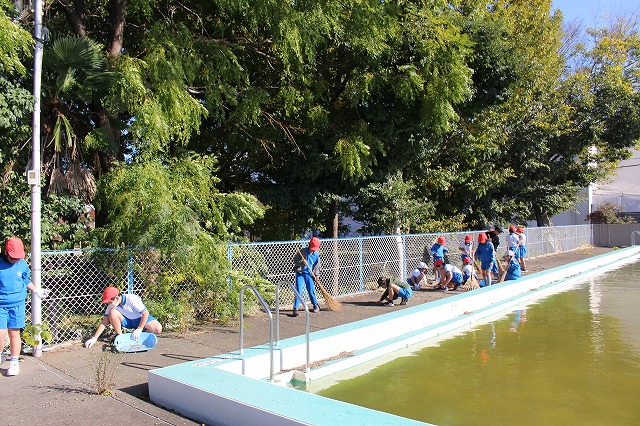 森に隣接しているプールサイドの掃除も行いました。
