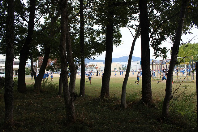 かけ足練習。高学年は森のすぐ横を走ります。